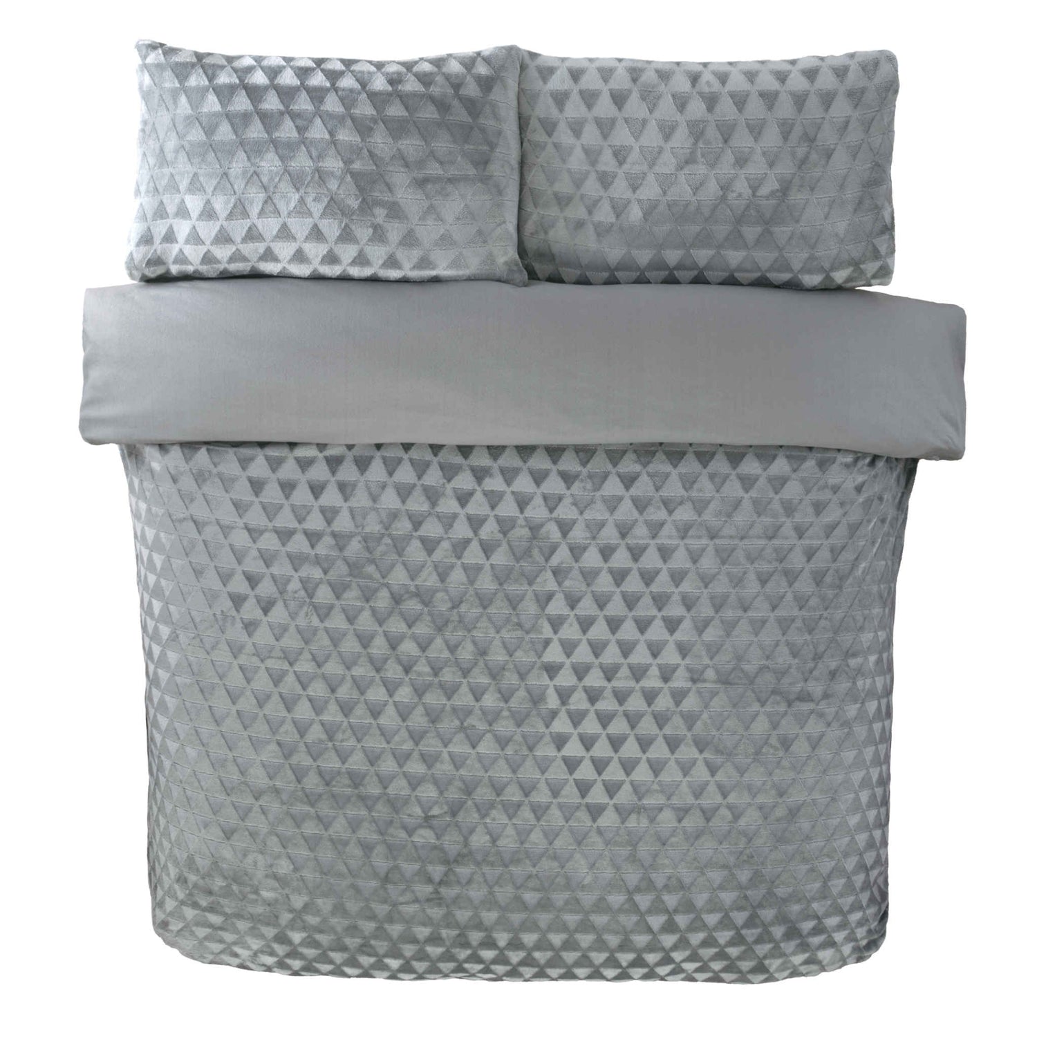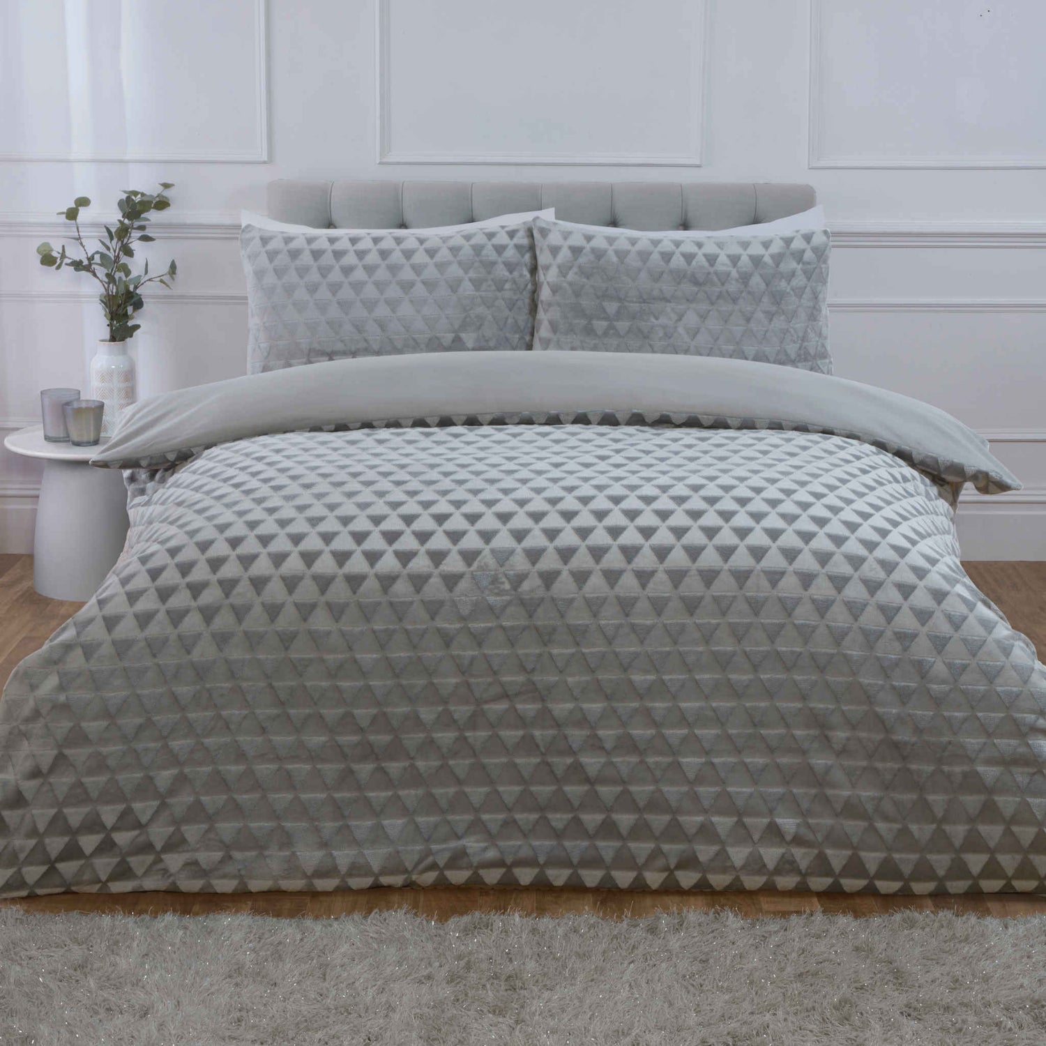 The duvet cover showcases a diamond-cut velvet texture, creating depth and subtle visual interest through light and shadow rather than colour contrasts. This sculpted design delivers a modern, understated elegance that complements a variety of bedroom styles. Available in Silver Grey and Navy, the colour options maintain a sophisticated palette that pairs seamlessly with other bedroom furnishings.